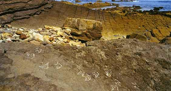 En marchant maintenant environ 300 m vers l´Ouest, on accède aux strates de grès gris d´une inclinaison de 24º sur lesquelles se trouvent plusieurs fossiles marins tridactyles et une empreinte de sauropode, cette dernière étant assez usée par l´érosion marine.